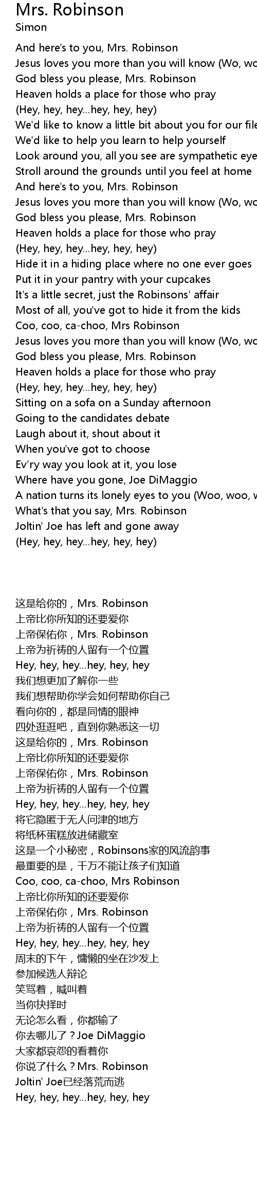 Coo, coo, ca-choo, Mrs Robinson |