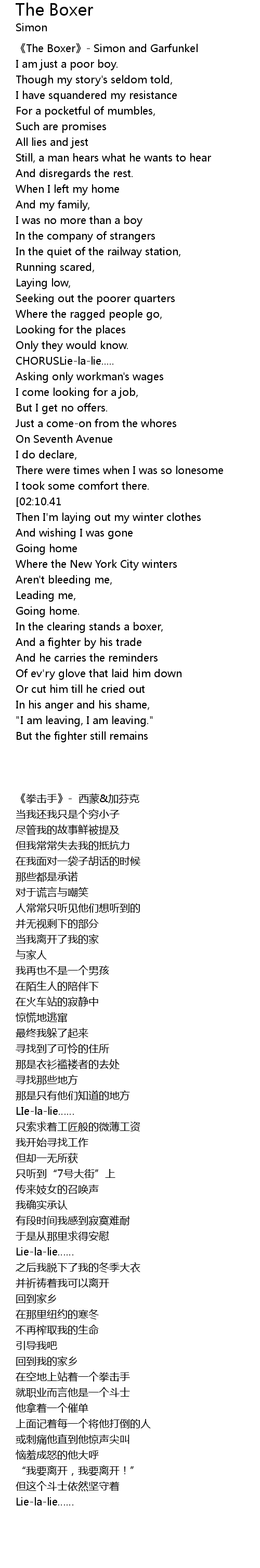 | [00:03.98] | 《The Boxer》- Simon and Garfunkel |