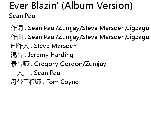 | [00:00.000] | zuo ci : Sean Paul Zumjay Steve Marsden Jigzagula |