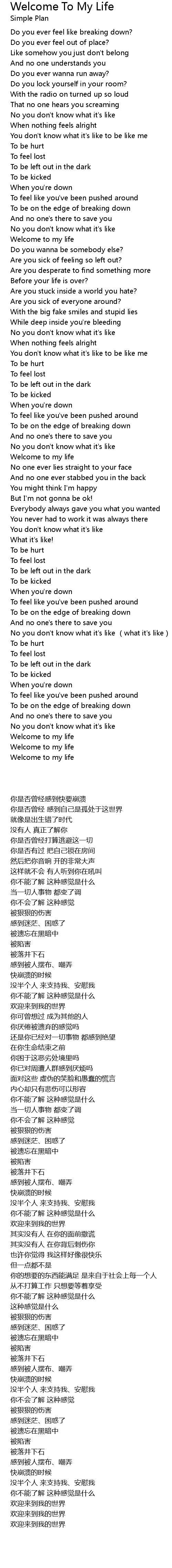 | Song | Welcome To My Life |