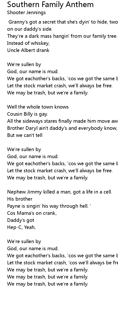 [Verse:] Granny's got a secret that she's dyin' to hide, two cousins got married on our daddy's side. |