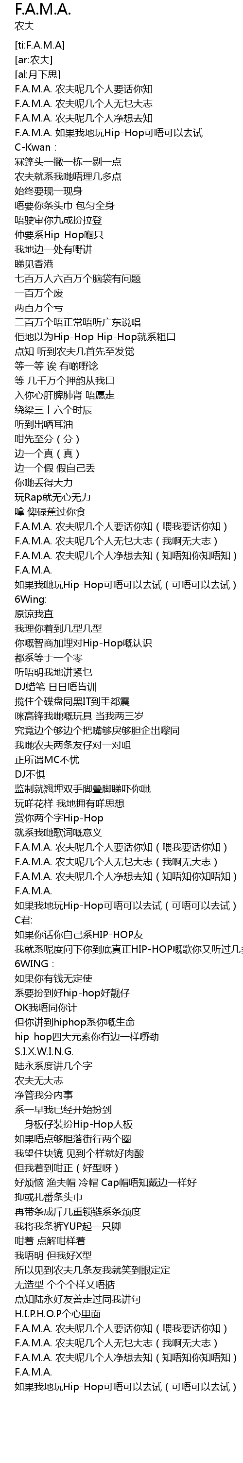 | [02:26.50] | F.A.M.A. 如果我地玩Hip-Hop可唔可以去试(可唔可以去试) |