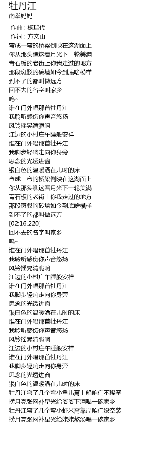 | [02:38.320] | 谁在门外唱那首牡丹江 |