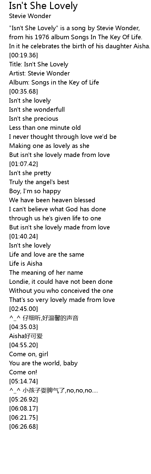 | [00:06.20] | "Isn't She Lovely" is a song by Stevie Wonder, |
