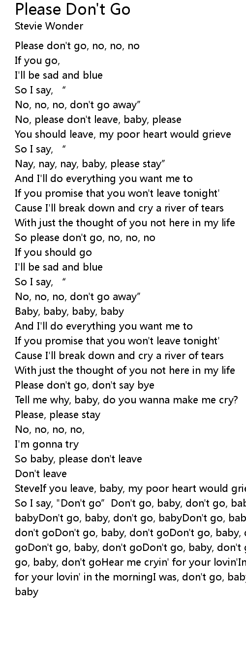 | So I say, "Don't go”Don't go, baby, don't go, babyDon't go, baby, don't go, babyDon't go, baby, don't go, babyDon't go, baby, don't go, babyDon't go, baby, don't goDon't go, baby, don't goDon't go, baby, don't goDon't go, baby, don't goDon't go, baby, don't goDon't go, baby, don't goDon't go, baby, don't goDon't go, baby, don't goHear me cryin' for your lovin'In the midnight hourI'm cryin' for your lovin' in the morningI was, don't go, babyHear me cryin', babyDon't go baby |
