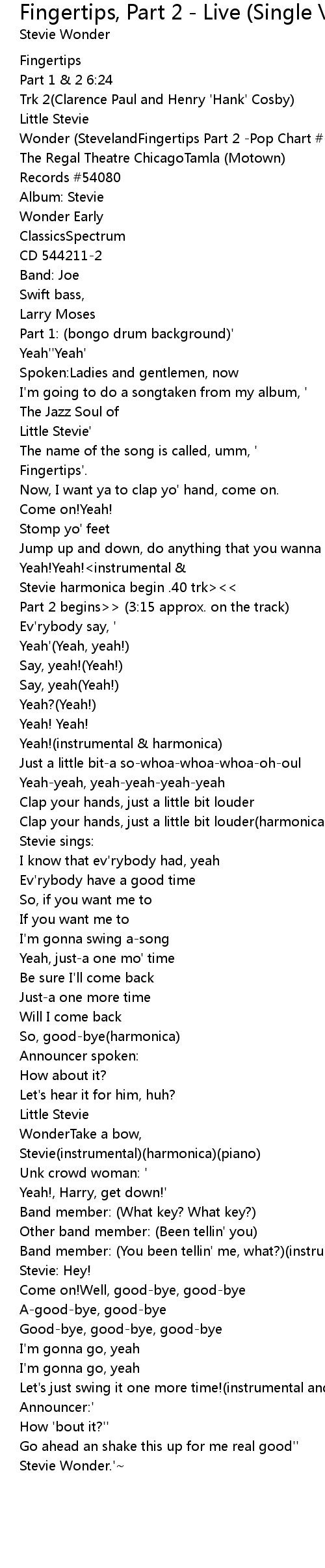 Wonder (StevelandFingertips Part 2 -Pop Chart #1 June 22, 1963Recorded: Live at The Regal Theatre ChicagoTamla (Motown) |