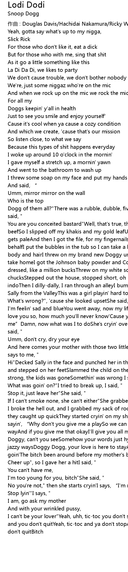| If I can't smoke none, she can't either"She grabbed my closely by my socksAnd so I broke the hell out, and I grabbed my sack of rocksBut um, they gave chase, they caught up quickThey started cryin' on my shoes and grabbin' my dickAnd sayin', “Why don't you give me a playSo we can break it down the Long Beach wayAnd if you give me that okayI'll give you all my love today”Doggy, Doggy, Doggy, can't you seeSomehow your words just hypnotize meAnd I just love your jazzy waysDoggy Dogg, your love is here to stayAnd on and on and on she kept goin'The bitch been around before my mother's bornI said, " | |