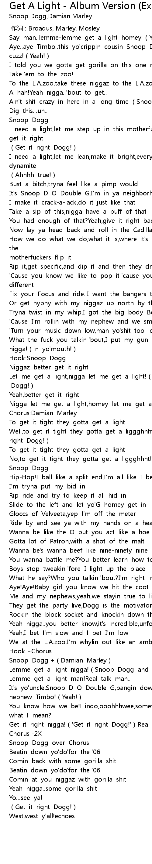 | [02:34.31] | Lemme get a light nigga! Snoop Dogg and Jr. Gong |