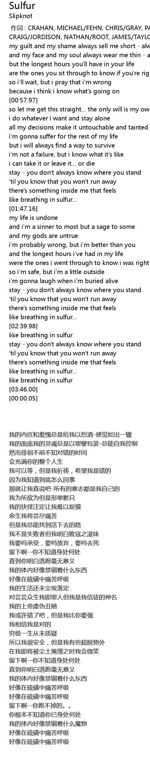 | [00:00.00] | 作词 : CRAHAN, MICHAEL/FEHN, CHRIS/GRAY, PAUL/JONES, CRAIG/JORDISON, NATHAN/ROOT, JAMES/TAYLOR, COREY/THOMS |