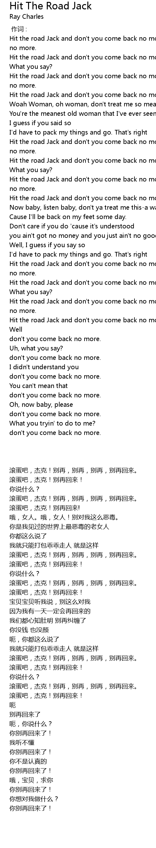 | [00:50.04] | Hit the road Jack and don't you come back no more, no more, no more, no more. |
