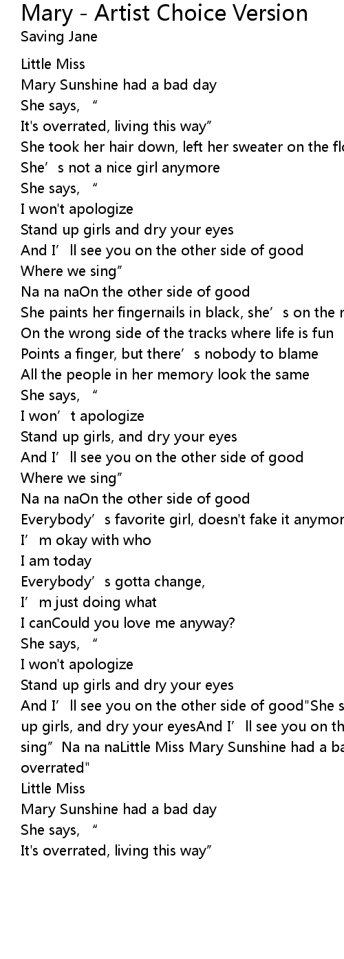 | And I' ll see you on the other side of good" She says, " I won' t apologizeStand up girls, and dry your eyesAnd I' ll see you on the other side of goodWhere we sing" Na na naLittle Miss Mary Sunshine had a bad dayAnd she says, " It' s overrated" | |