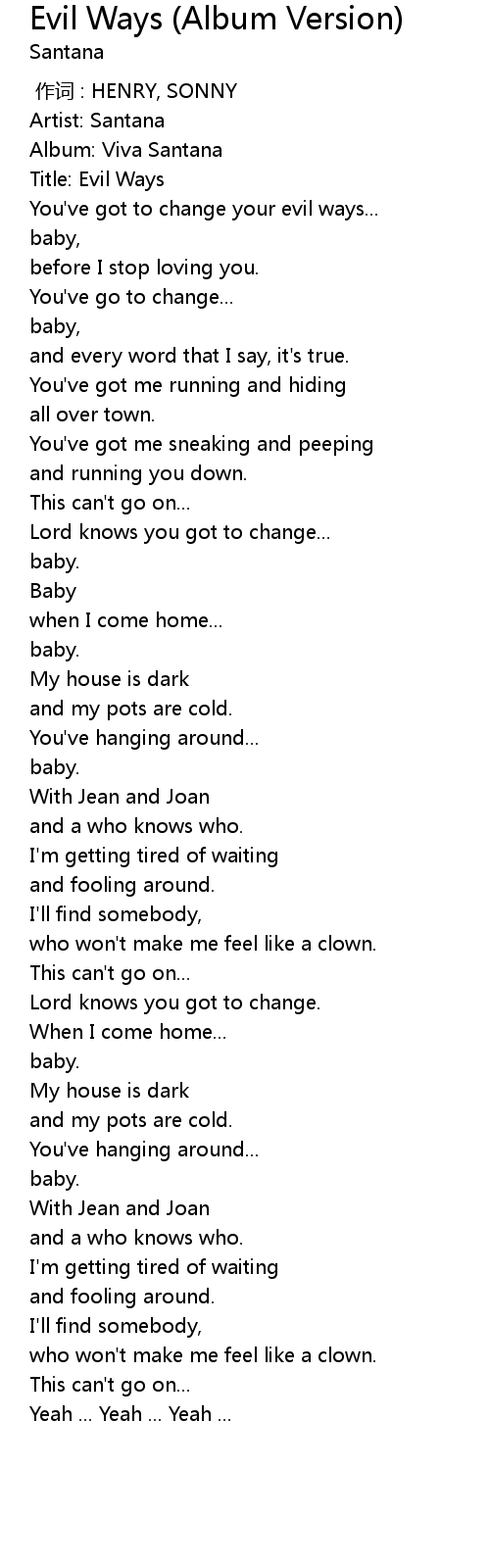 | [00:05.73] | Title: Evil Ways |