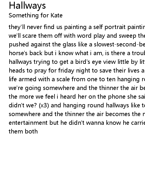 they'll never find us painting a self portrait painting ourselves into position we'll scare them off with word play and sweep them under the rug my face is pushed against the glass like a slowest-second-better off and thrown from the horse's back but i know what i am, is there a trouble with that? hanging round hallways trying to get a bird's eye view little by little (x2) they bow their heads to pray for friday night to save their lives and then they go on through life armed with a scale from one to ten hanging round hallways like to feel like we're going somewhere and the thinner the air becomes the more we feel at home the more we feel i heard her on the phone she said, you said, had a good day didn't we? (x3) and hanging round hallways like to feel like we're going somewhere and the thinner the air becomes the more we feel she said that's entertainment but he didn't wanna know he carried the shopping bag she carried them both |