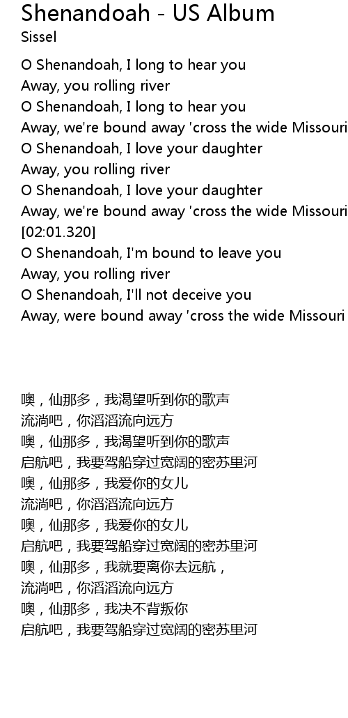 | [00:38.870] | O Shenandoah, I long to hear you |
