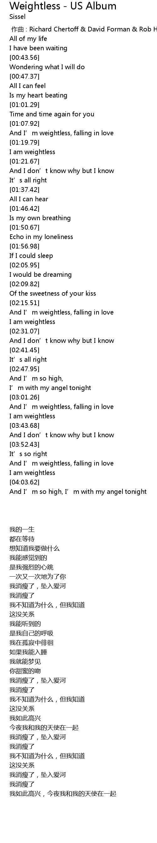 | [03:58.44] | And I' m weightless, falling in love |
