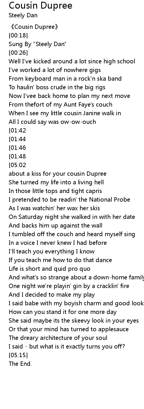 | [05:09][05:02][04:55][04:48][04:41][04:34][04:28][04:21][04:14][04:07][04:01][03:54][03:50][03:47][03:43][01:53][01:50][01:09][01:05] | How about a kiss for your cousin Dupree |
