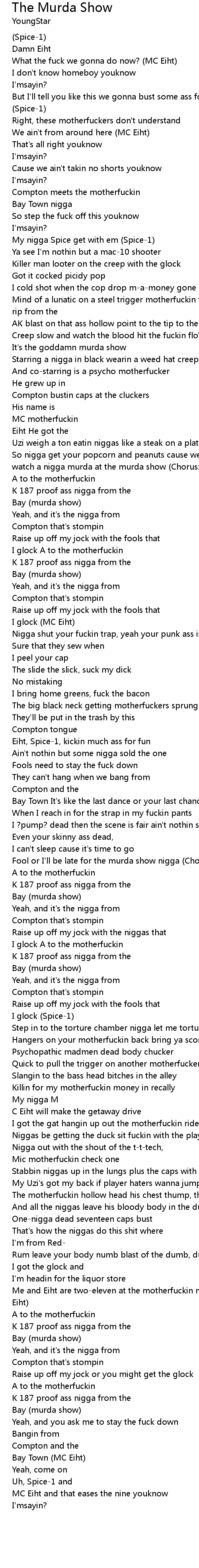 So nigga get your popcorn and peanuts cause we nuts and we know sit back and watch a nigga murda at the murda show (Chorus: Spice-1 & MC Eiht) |