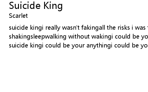 | suicide kingi really wasn't fakingall the risks i was takingi really can't stop shakingsleepwalking without wakingi could be your suicide kingi could be your suicide kingi could be your anythingi could be your everything |