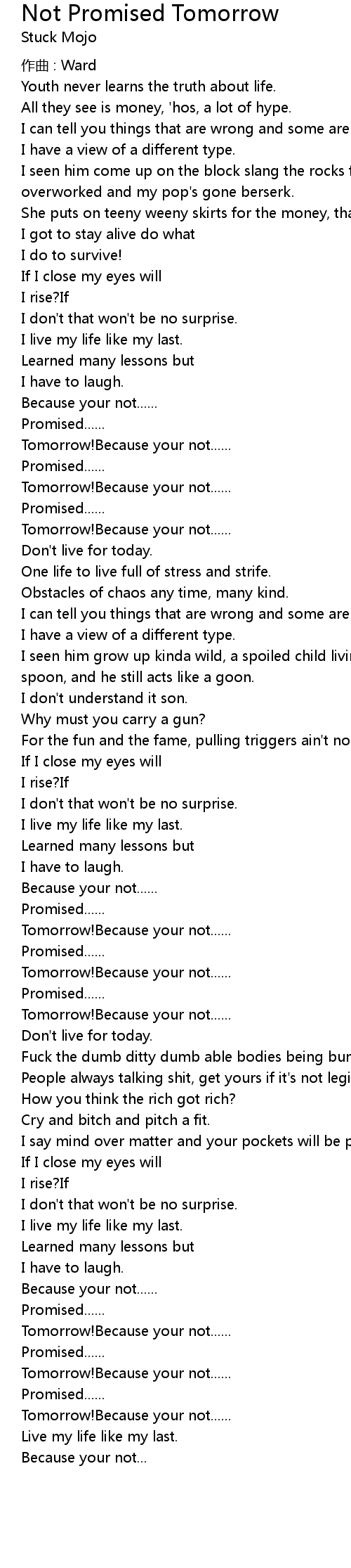 | Song | Not Promised Tomorrow |
