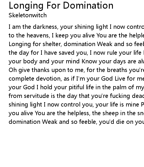 I am the darkness, your shining light I now control you, your life is mine Pray to the heavens, I keep you alive You are the helpless, the sheep in the snow Longing for shelter, domination Weak and so feeble, you'd die on your own Praise the day for I have saved you, I now rule your life Now bestow your gifts to me, your body and your mind Know your days are always numbered, I decide your fate Oh give thanks upon to me, for the breaths you're allowed to take Sick is your complete devotion, as if I'm your God Live for me your fucking savior, as if I'm your God I hold your pitiful life in the palm of my goddamn hand Your release from servitude is the day that you're fucking dead I am the darkness, your shining light I now control you, your life is mine Pray to the heavens, I keep you alive You are the helpless, the sheep in the snow Longing for shelter, domination Weak and so feeble, you'd die on your own |