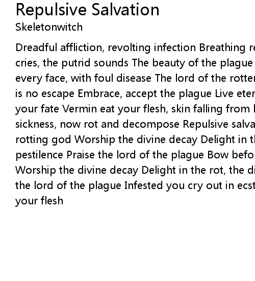Dreadful affliction, revolting infection Breathing repugnance and death Hear the cries, the putrid sounds The beauty of the plague upon your tongue Distorting every face, with foul disease The lord of the rotten marches on From waste there is no escape Embrace, accept the plague Live eternally rotten, as maggots seal your fate Vermin eat your flesh, skin falling from bone Delight in your sickness, now rot and decompose Repulsive salvation Bow before the filth, your rotting god Worship the divine decay Delight in the rot, the disease and pestilence Praise the lord of the plague Bow before the filth, your rotting god Worship the divine decay Delight in the rot, the disease and pestilence Praise the lord of the plague Infested you cry out in ecstasy Rats and maggots cleanse your flesh |