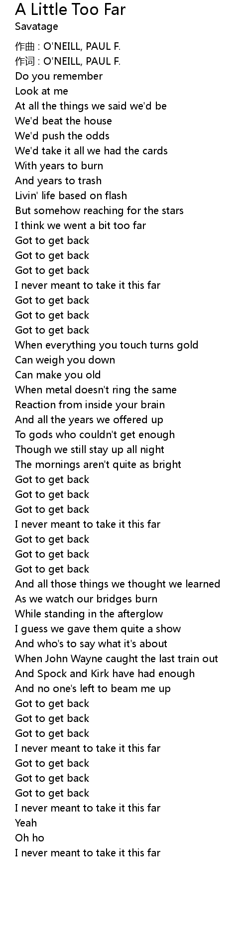 | Song | A Little Too Far |