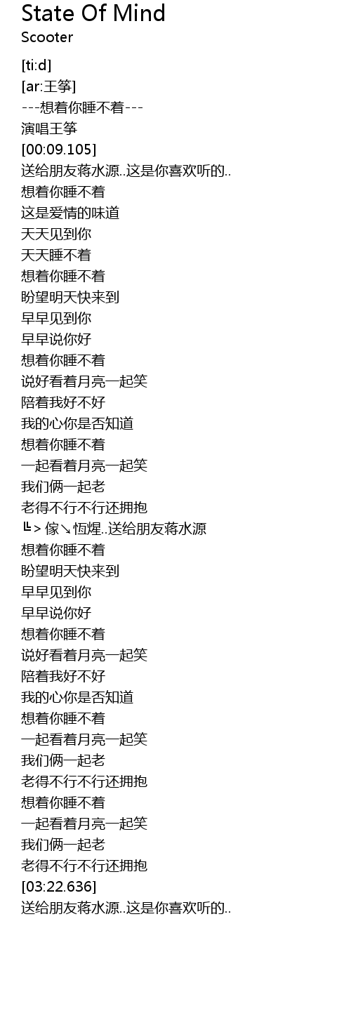 | [00:13.715] | sòng gěi péng yǒu jiǎng shuǐ yuán.. zhè shì nǐ xǐ huān tīng de.. |