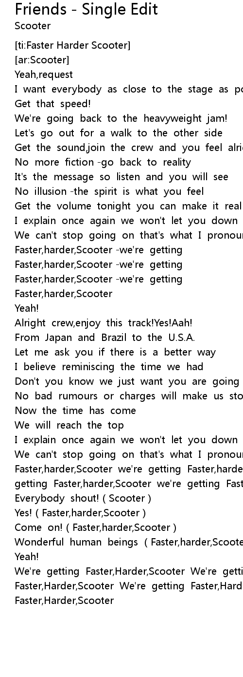 | [03:05.04] | We' re getting Faster, Harder, Scooter We' re getting Faster, Harder, Scooter We' re getting Faster, Harder, Scooter Faster, Harder, Scooter |