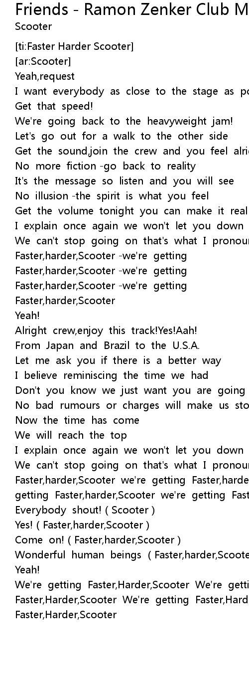 | [03:05.04] | We' re getting Faster, Harder, Scooter We' re getting Faster, Harder, Scooter We' re getting Faster, Harder, Scooter Faster, Harder, Scooter |