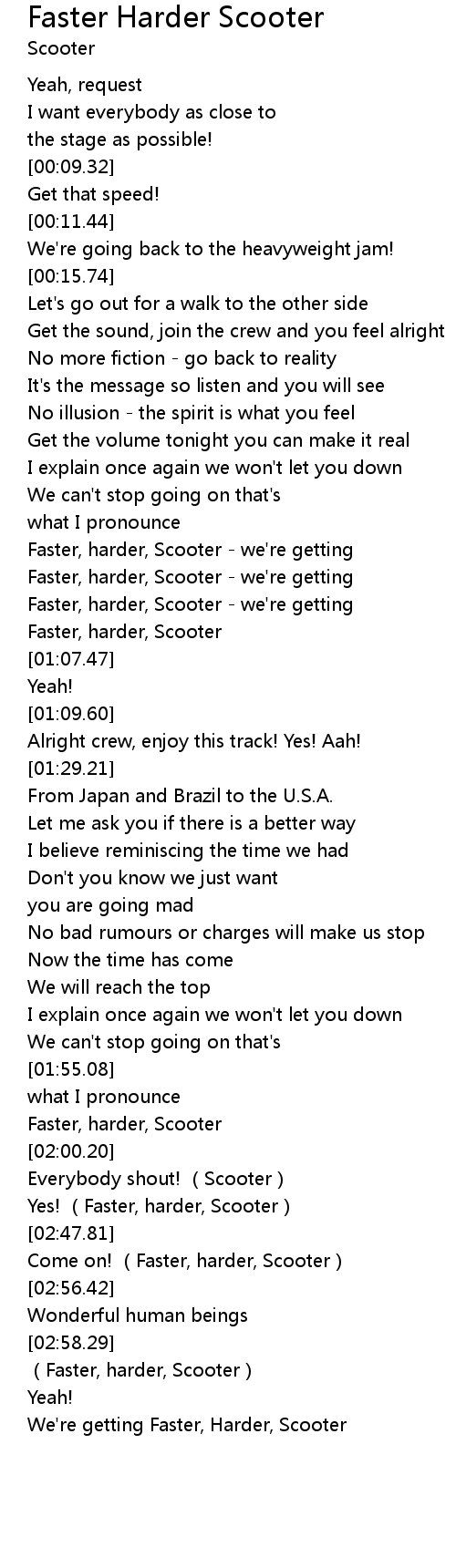 | [00:56.85] | Faster, harder, Scooter we' re getting |