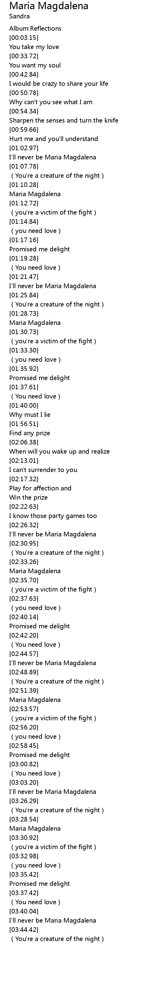 | [03:23.36] | I'll never be Maria Magdalena |