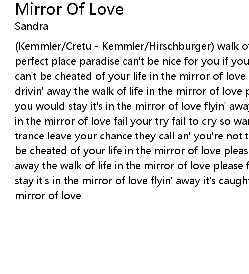 | (Kemmler/Cretu - Kemmler/Hirschburger) walk of life feels so nice an' here's the perfect place paradise can't be nice for you if you can feel an' you know you can't be cheated of your life in the mirror of love please feel me we'll be drivin' away the walk of life in the mirror of love please feel me an' i wish you would stay it's in the mirror of love flyin' away it's caught in crystal ice in the mirror of love fail your try fail to cry so warm the walk of life stay in trance leave your chance they call an' you're not there an' you know you can't be cheated of your life in the mirror of love please feel me we'll be drivin' away the walk of life in the mirror of love please feel me an' i wish you would stay it's in the mirror of love flyin' away it's caught in crystal ice in the mirror of love |
