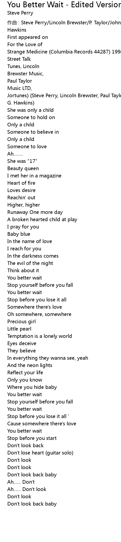 | 作曲 : Steve Perry/Lincoln Brewster/P. Taylor/John Pierce/Moyes Lucas/George Hawkins | |