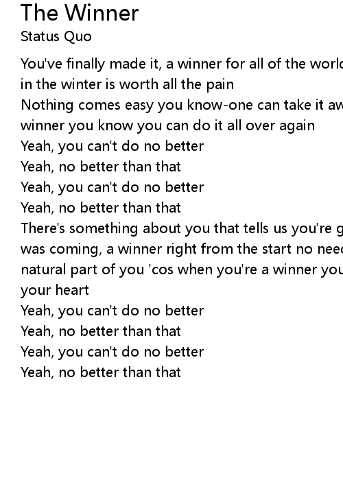 There's something about you that tells us you're gonna go all the way we knew it was coming, a winner right from the start no need to feel lonely that's only a natural part of you 'cos when you're a winner you know you can do it with all of your heart |