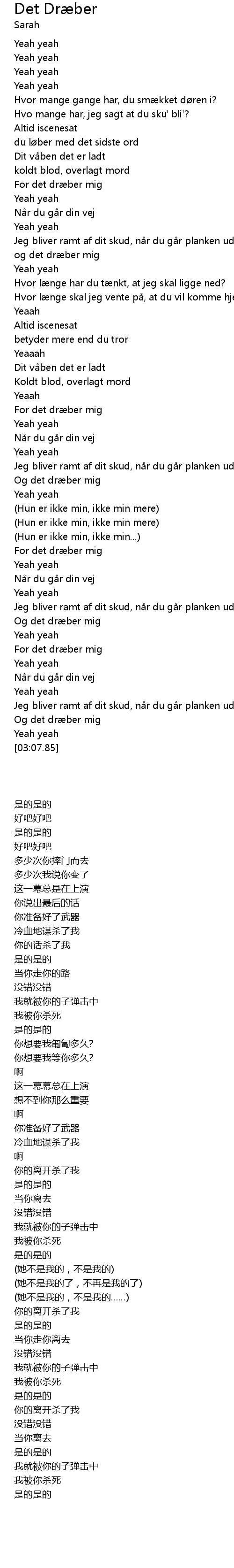 | [02:57.24] | Jeg bliver ramt af dit skud, når du går planken ud, |