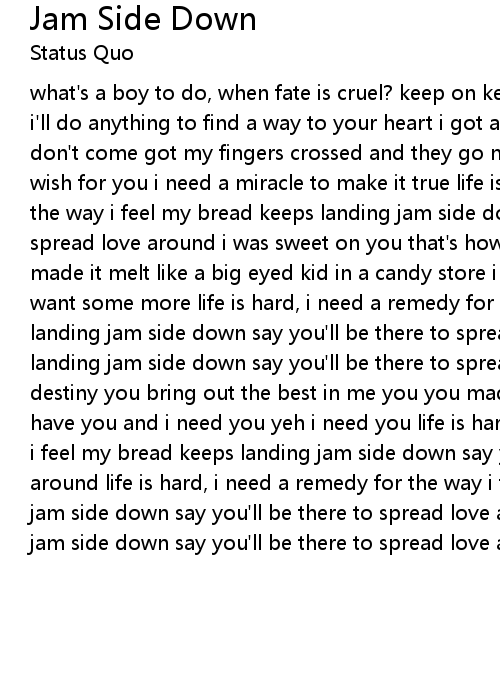 what's a boy to do, when fate is cruel? keep on keepin' on try to bend the rules i'll do anything to find a way to your heart i got a rabbit's foot but luck don't come got my fingers crossed and they go numb, i can hold my breath and wish for you i need a miracle to make it true life is hard, i need a remedy for the way i feel my bread keeps landing jam side down say you'll be there to spread love around i was sweet on you that's how i felt got a butter heart, you made it melt like a big eyed kid in a candy store i had a little sugar now i want some more life is hard, i need a remedy for the way i feel my bread keeps landing jam side down say you'll be there to spread love around my bread keeps landing jam side down say you'll be there to spread love around you are my destiny you bring out the best in me you you made me feel so lucky so lucky to have you and i need you yeh i need you life is hard, i need a remedy for the way i feel my bread keeps landing jam side down say you'll be there to spread love around life is hard, i need a remedy for the way i feel my bread keeps landing jam side down say you'll be there to spread love around my bread keeps landing jam side down say you'll be there to spread love around |
