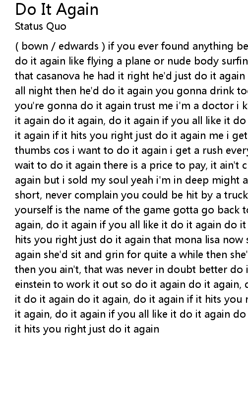 ( bown / edwards ) if you ever found anything better than working you'd want to do it again like flying a plane or nude body surfing you'd want to do it again that casanova he had it right he'd just do it again he'd do it again all day and all night then he'd do it again you gonna drink too much say never no more but you're gonna do it again trust me i'm a doctor i know for sure you're gonna do it again do it again, do it again if you all like it do it again do it again, do it again if it hits you right just do it again me i get time off i twiddle my thumbs cos i want to do it again i get a rush every night when 8.45 comes can't wait to do it again there is a price to pay, it ain't cheap if you want to do it again but i sold my soul yeah i'm in deep might as well do it again life is short, never complain you could be hit by a truck, fall under a train enjoying yourself is the name of the game gotta go back tonight and do it again do it again, do it again if you all like it do it again do it again, do it again if it hits you right just do it again that mona lisa now she could smile and do it again she'd sit and grin for quite a while then she'd do it again you is here then you ain't, that was never in doubt better do it again don't take no einstein to work it out so do it again do it again, do it again if you all like it do it again do it again, do it again if it hits you right just do it again do it again, do it again if you all like it do it again do it again, do it again if it hits you right just do it again |
