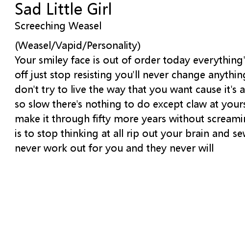 Your smiley face is out of order today everything's wrong and you can't shutit off just stop resisting you'll never change anything start sharpening yourclaws don't try to live the way that you want cause it's a lost cause the timegoes by so slow there's nothing to do except claw at yourself just try to finda way to make it through fifty more years without screaming all the way theone solution is to stop thinking at all rip out your brain and sew up yourmouth cuase things never work out for you and they never will |