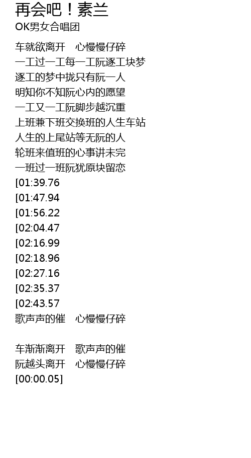 | [03:08.32][01:39.76] | 最爱的彼个 可爱的冤家 心爱的素兰啊喂 |
