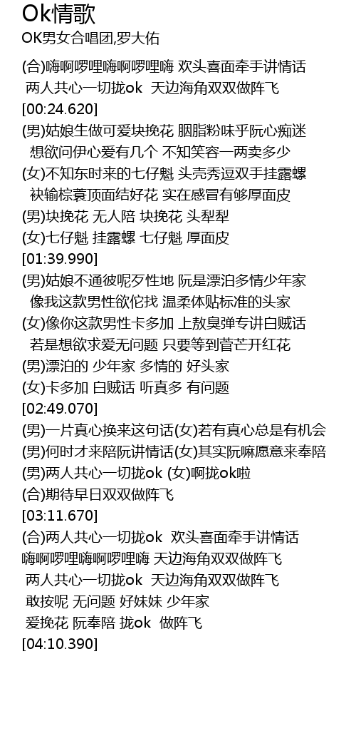 | [03:01.320] | (男)两人共心一切拢ok (女)啊拢ok啦 |