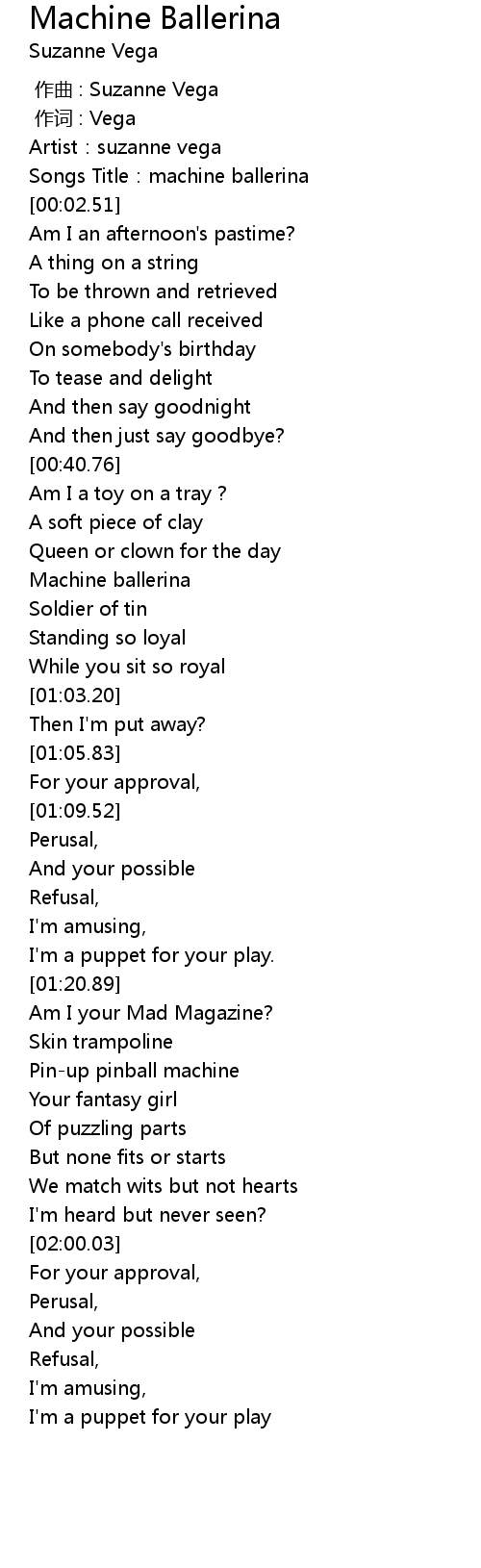 | [00:00.00] | 作曲 : Suzanne Vega |