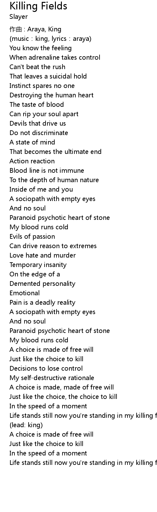 | Life stands still now you're standing in my killing field | |