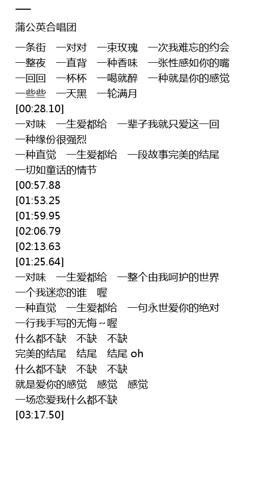 | [02:20.59][01:53.25][00:58.29] | 一条街 一对对 一束玫瑰 一次我难忘的约会 |