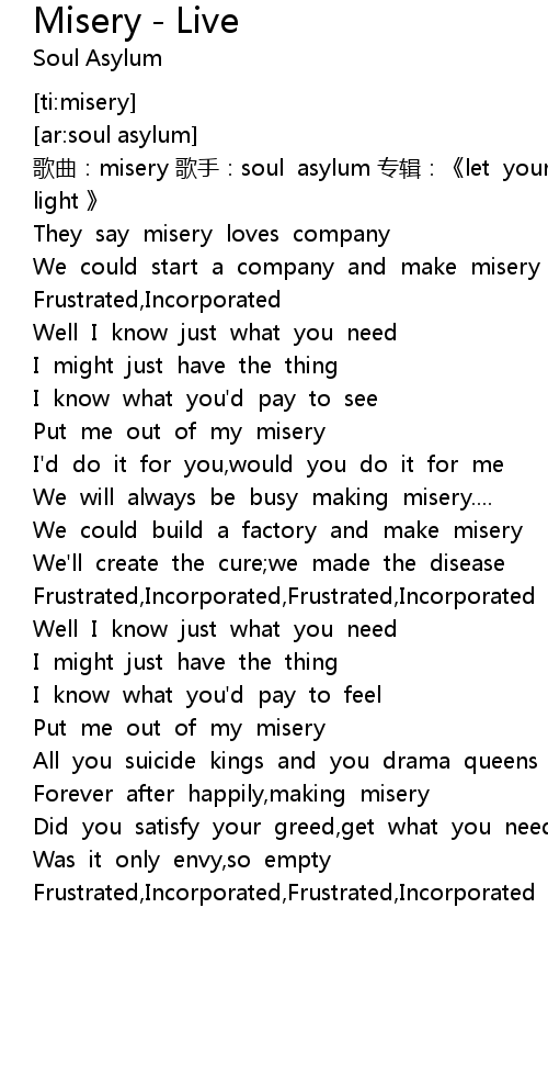 | [00:05.71] | 歌曲:misery 歌手:soul asylum 专辑:《let your dim light 》 |