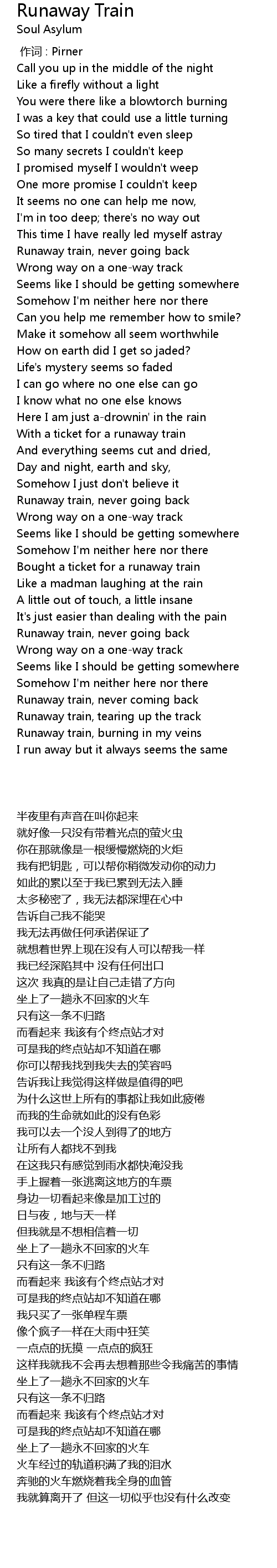 | [03:29.350] | Runaway train, never coming back |