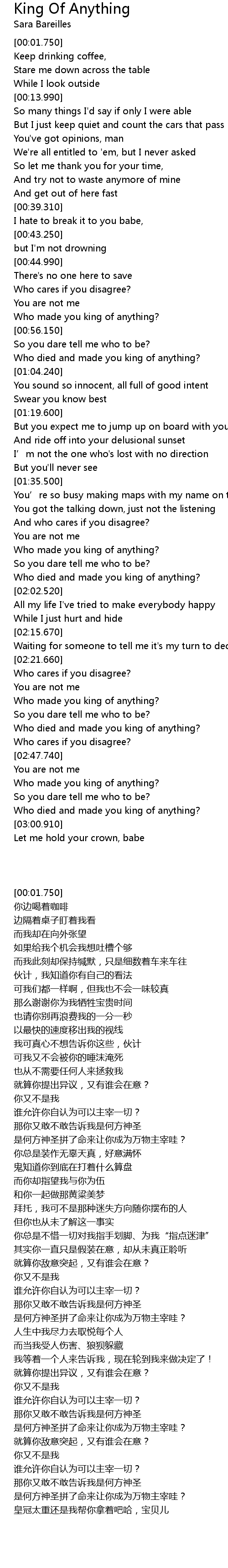 | [02:50.300] | Who made you king of anything? |