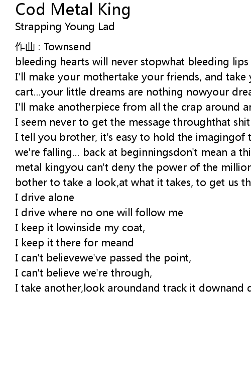 | I tell you brother, it' s easy to hold the imagingof the cod metal kingfalling, we' re falling... back at beginningsdon' t mean a thing when you come to the cod metal kingyou can' t deny the power of the millions who are weak, they never bother to take a look, at what it takes, to get us through the sheep3 am | |