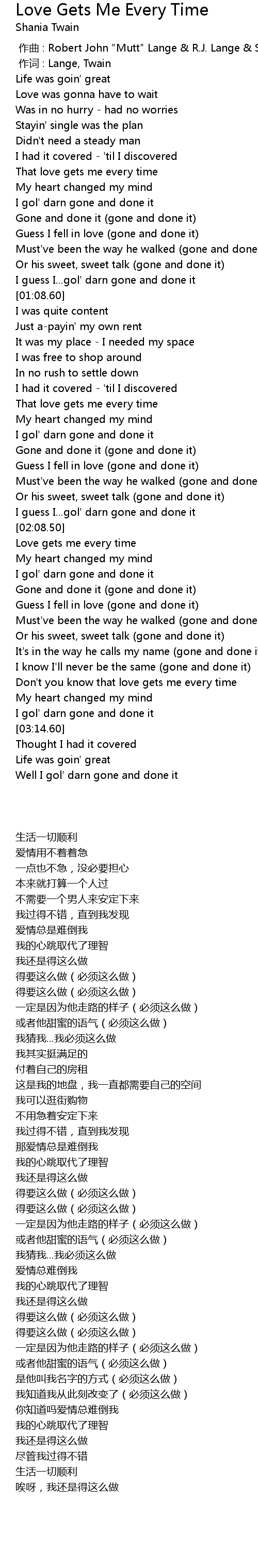 | [00:00.00] | 作曲 : Robert John "Mutt" Lange & R.J. Lange & Shania Twain |
