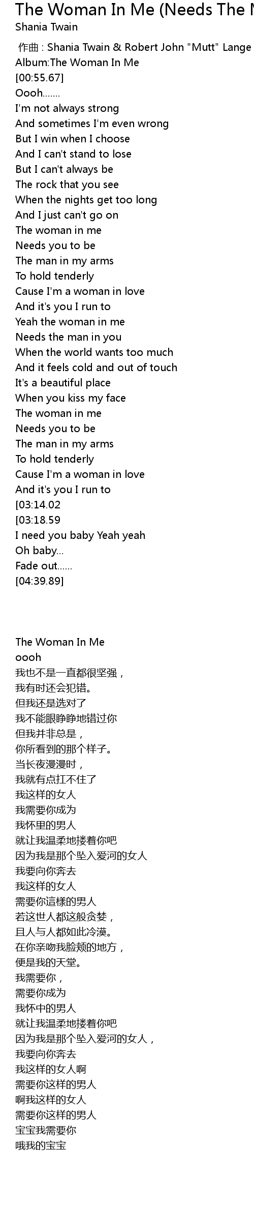 | [00:00.00] | 作曲 : Shania Twain & Robert John "Mutt" Lange |