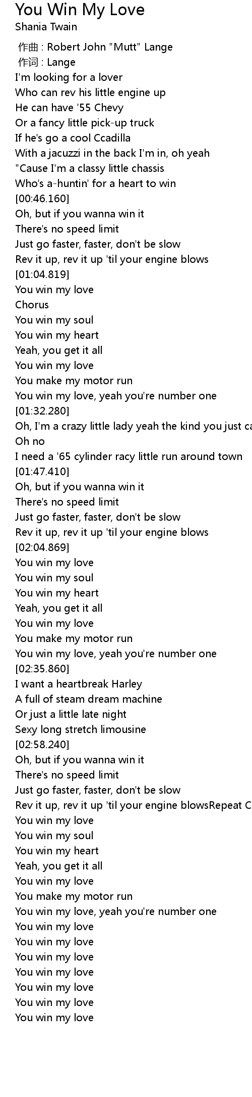 | [03:12.830] | Rev it up, rev it up 'til your engine blowsRepeat ChorusYou win my love.... |